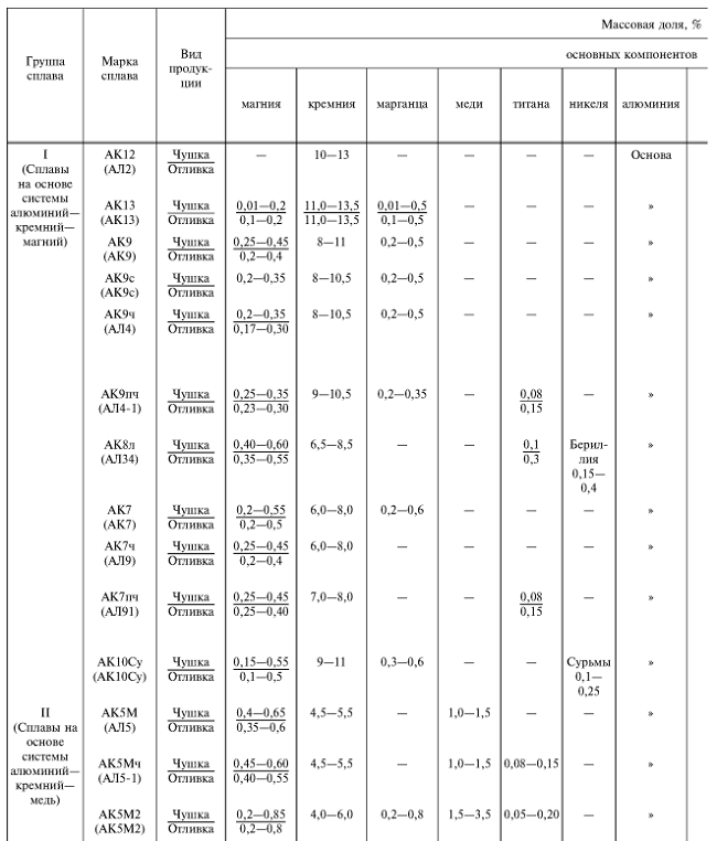 АК7 представляет собой металлический сплав на основе алюминия, содержание которого в АК7 может варьироваться от 87,6% до 93,6%. Кремний, марганец и магний неизбежно присутствуют в сплавах АК7. Допустимое количество примесей определяется таблицей химического состава.
